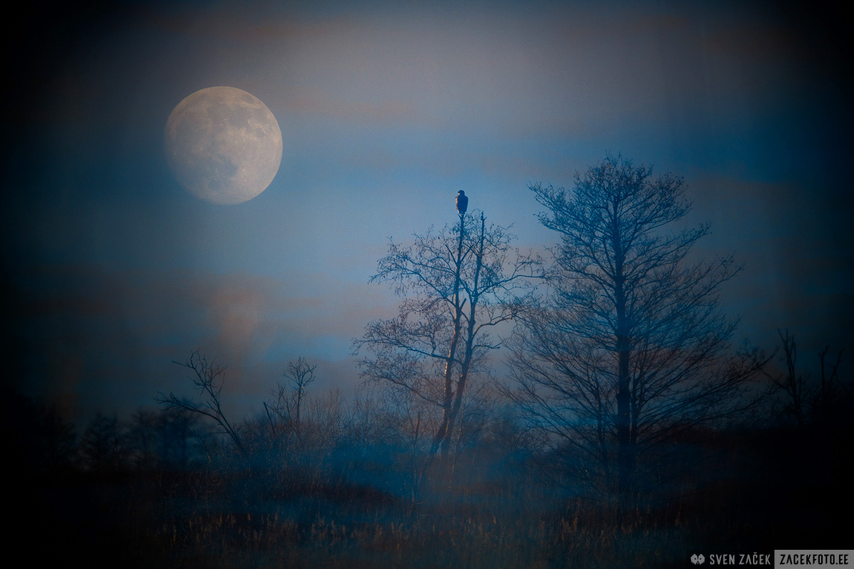 Artistic photo made with multiple exposure combining two shots onto one frame. I was pushing myself through some willow bushes chasing beaver tracks when I noticed a white-tailed sea eagle hunting on top of an alder tree at the opposite side of a river. Behind me an almost full moon had ascended onto a twilight coloured sky. So I decided to combine the two sights into one photograph. The nice dark frame was created by the willows, where I was hiding.