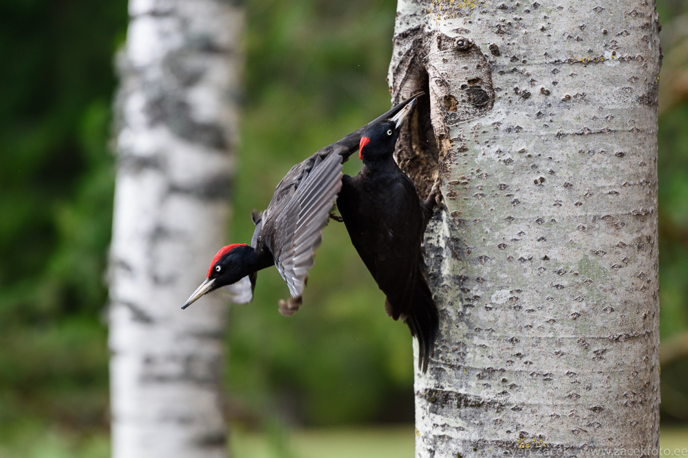 One rocket is arriving and the other one is taking off. Black Woodpeckers sharing their family duties. During the hatching and keeping very young nestlings warm the pair trades duties. Usually the female stays on the nest for two hours and the male for one and a half. Nighttime obligations rest on the shoulders of the male for about 90% of the time. At least that is the behavior in this family.